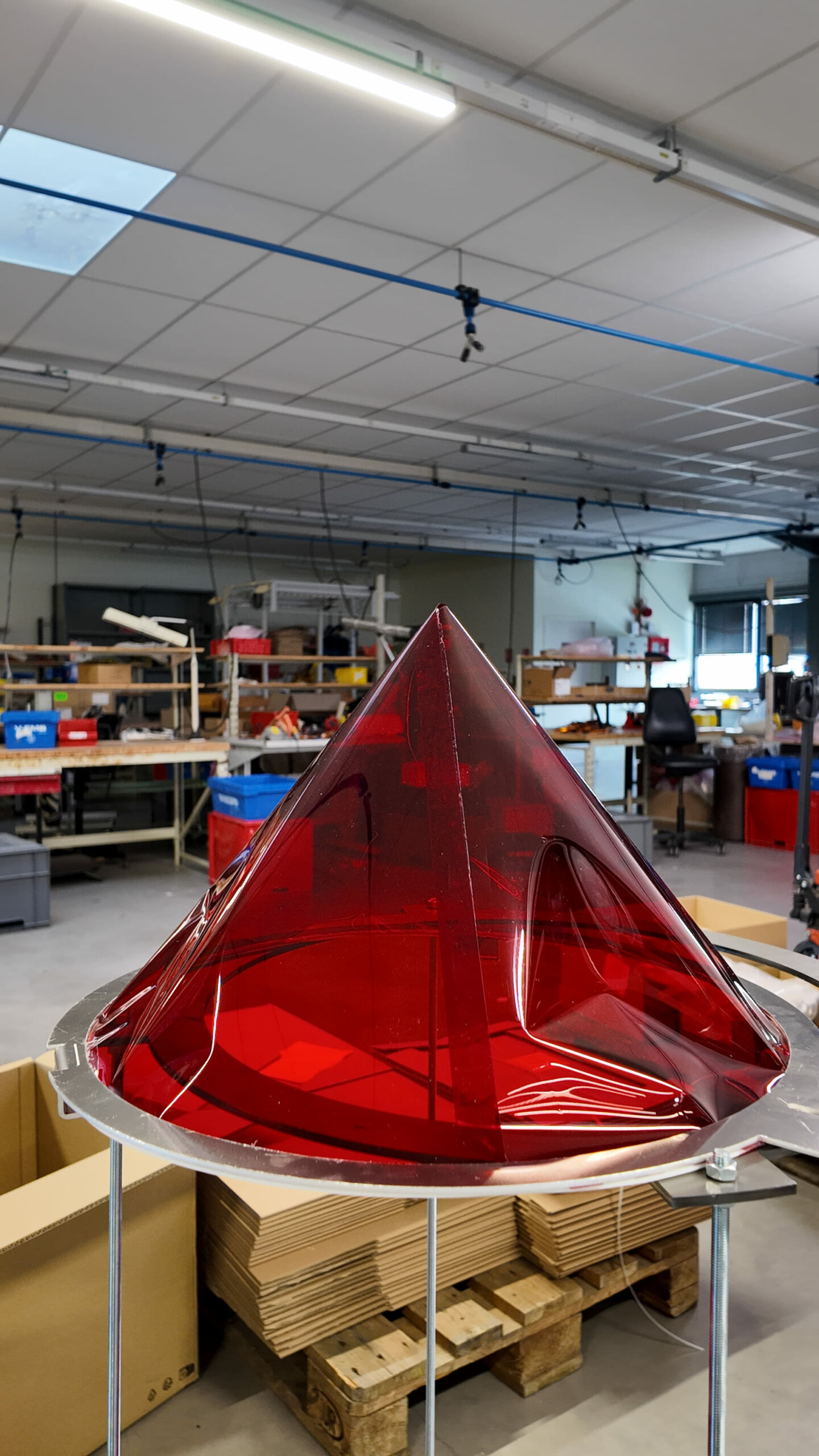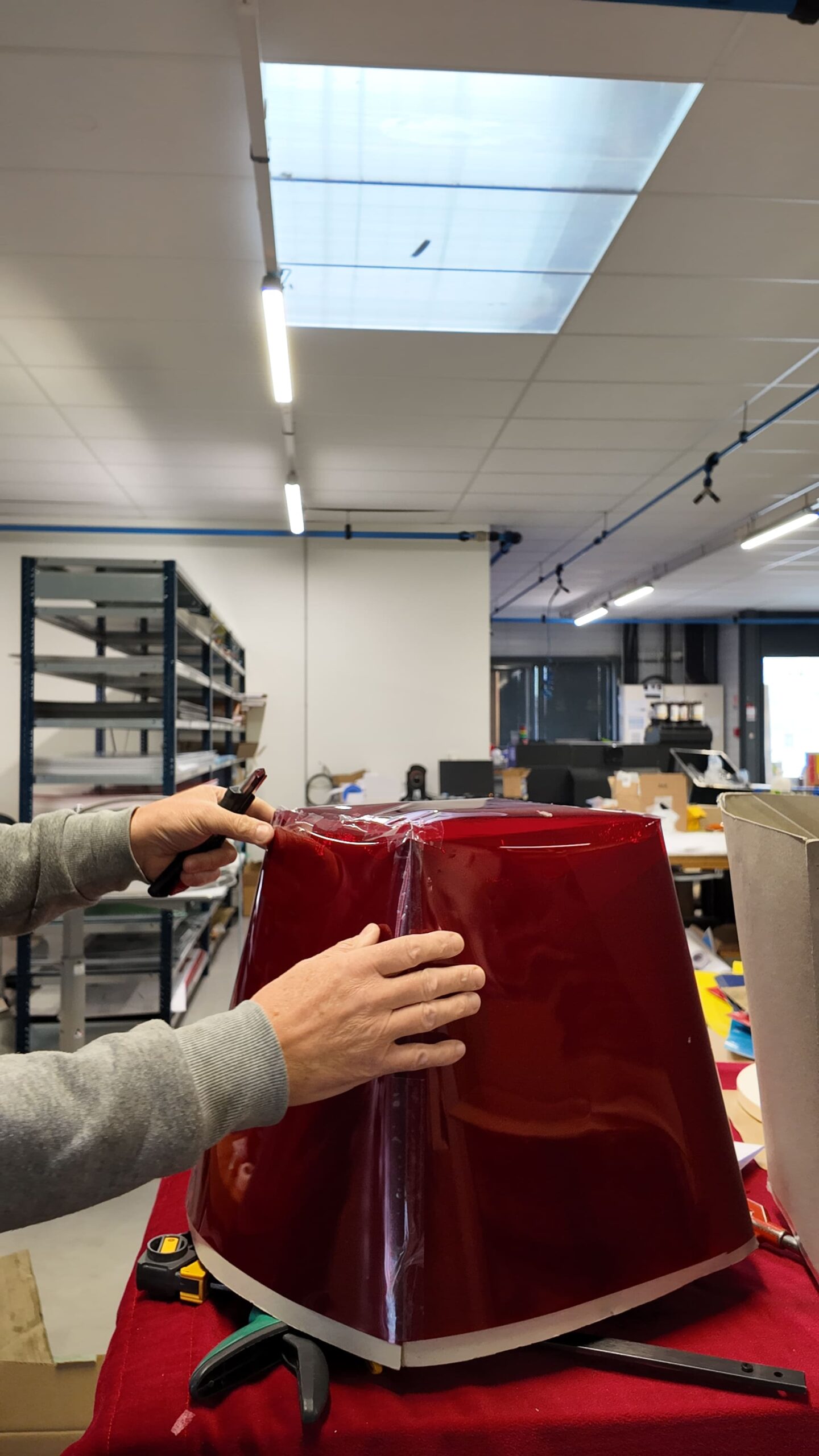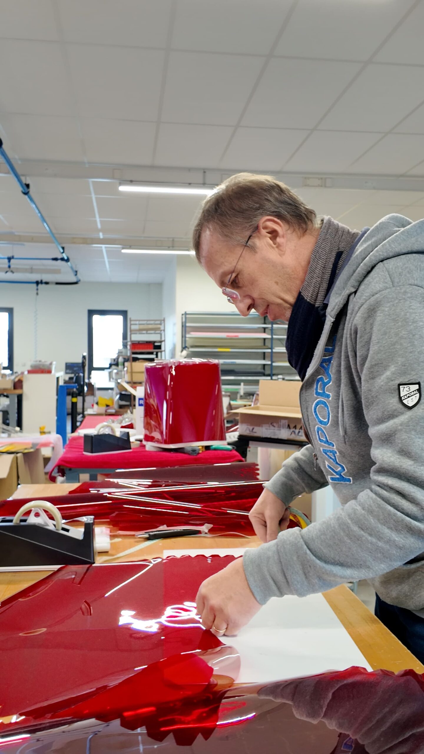 Après validation des essais en septembre, la production a été lancée dans les ateliers de l’ESAT. Les ouvriers ont assuré la découpe des feuilles colorées, la fabrication des cadres métalliques et le montage des gélatines sur leurs supports. Près de 800 gélatines ont ainsi été préparées, certaines livrées avec cadres, d’autres sans.